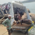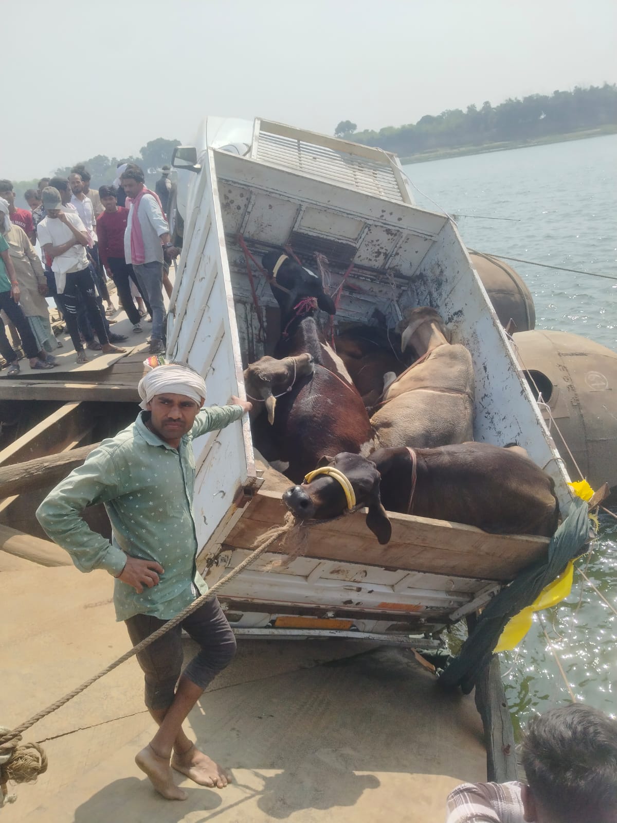 पीपा पुल पर बड़ा हादसा टला, मवेशियों से लदा पिकअप वाहन फंसा