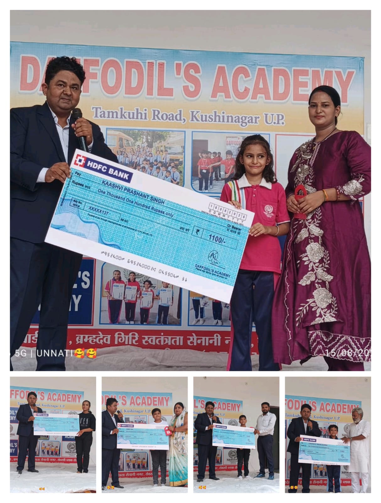 तमकुहीराज कुशीनगर। नगर पंचायत सेवरही के वार्ड नम्बर एक,ब्रह्मदेव गिरि स्वतंत्रता सेनानी नगर, तमकुही रोड के पकड़ीयार पूरबपट्टी स्थित प्रसिद्ध डैफोडिल्स एकेडमी ने स्वतंत्रता दिवस पर आयोजित स्टुडेंट्स आफ द ईयर एचिवर क्लब वार्षिक पुरस्कार वितरण समारोह के दौरान अपने छात्रों की शैक्षणिक उपलब्धियों का जश्न मनाया। इस समारोह की शुरुआत डायरेक्टर मनीष गिरि के प्रेरक संबोधन से हुई और छात्रों को मूल्यों को बनाए रखने और उत्कृष्टता हासिल करने के लिए प्रोत्साहित किया गया। इसमें मुख्य अतिथि के रूप में मेधावी छात्रों के अभिभावकगण शामिल हुए। शैक्षणिक सत्र 2024-25 के उच्च प्रदर्शन करने वाले छात्रों सुमित, अनामिका,काश्वी , चैतन्य, रचित को 1100- 1100 रुपये का प्रोत्साहन सम्मान राशि का चेक देकर सम्मानित कर उनका उत्साहवर्धन किया गया। वहीं राष्ट्रीय स्तर की प्रतियोगी परीक्षा में उत्कृष्ट प्रदर्शन करने वाले छात्रों सिद्धी, अनामिका व छवि को प्रशस्ति पत्र,मेडल व विशेष गिफ्ट हेम्पर प्राप्त करने पर उनके चेहरे खिल उठे। डैफोडिल्स एकेडमी छात्रों के सर्वांगीण विकास हेतु निरंतर तत्पर है और भविष्य में ऐसे बडे़ अवसरों के लिए छात्रों के लिए प्रयासरत है।