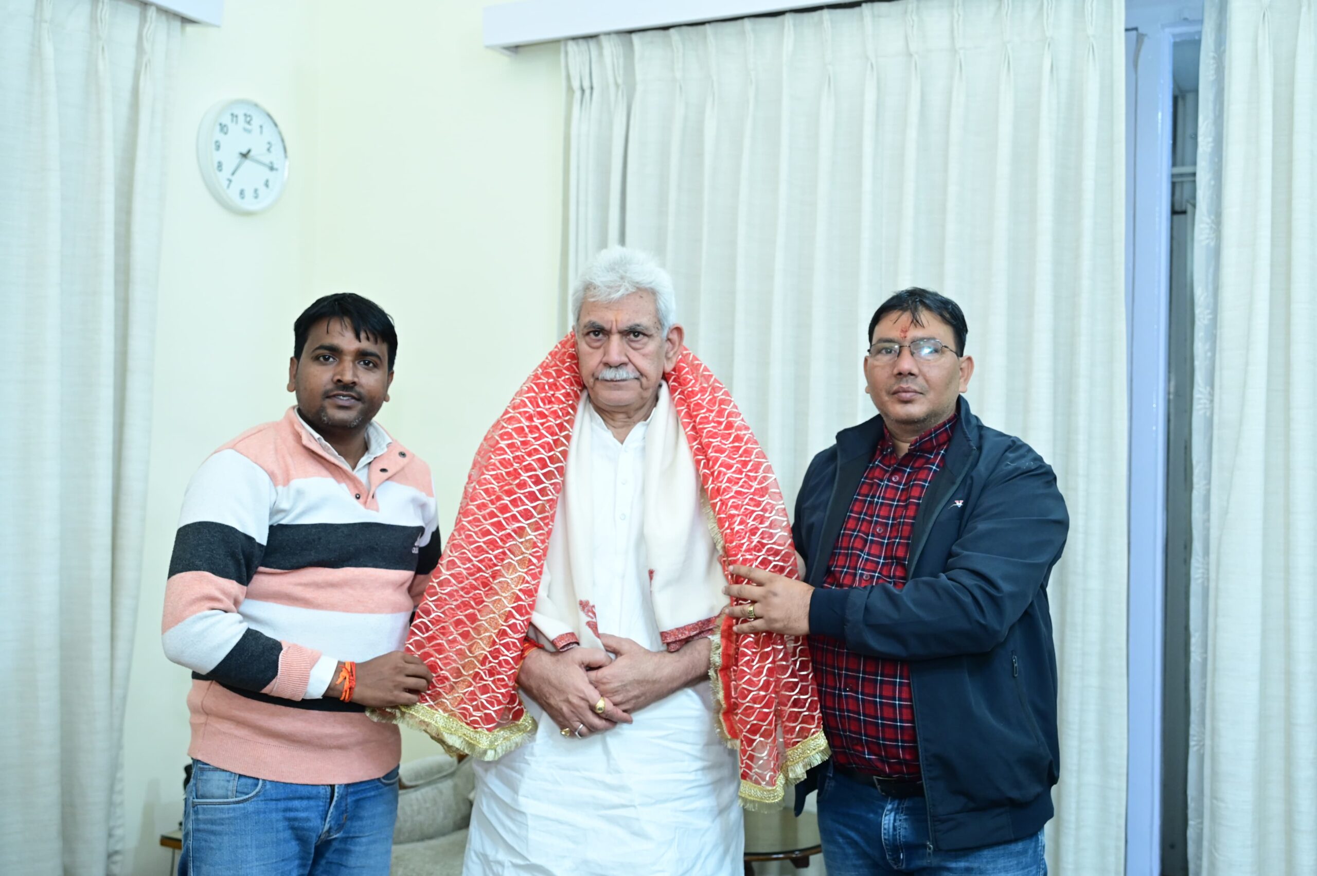 नंदगंज (गाज़ीपुर), शनिवार को भारतीय जनता पार्टी, गाज़ीपुर के नन्दगंज मण्डल के पूर्व मण्डल अध्यक्ष एवं सोशल मीडिया–आईटी विभाग के पूर्व संयोजक विनीत कुमार शर्मा ने भाजपा कार्यकर्ता विकास सिंह के साथ जम्मू-कश्मीर के उपराज्यपाल महामहिम श्री मनोज सिन्हा से जम्मू स्थित राजभवन में शिष्टाचार भेंट की। दोनों कार्यकर्ताओं ने मां वैष्णो देवी के दर्शन के उपरांत लाई गई मां की चुनरी ओढ़ाकर उपराज्यपाल का सम्मान किया। इस दौरान श्री सिन्हा ने गाज़ीपुर जिले के संगठन व कार्यकर्ताओं की कुशलक्षेम की जानकारी ली।भेंट के उपरांत विनीत शर्मा ने बताया कि “श्री मनोज सिन्हा जी अपने जड़ों से किस तरह जुड़े हुए हैं, यह उनके प्रत्येक कार्यकर्ता से स्नेहपूर्ण मिलन से स्पष्ट होता है। जम्मू-कश्मीर में जिम्मेदारियों का निर्वहन करते हुए भी उनका मन सदैव अपनी जन्मभूमि गाज़ीपुर के विकास और लोगों के प्रति समर्पित रहता है।”