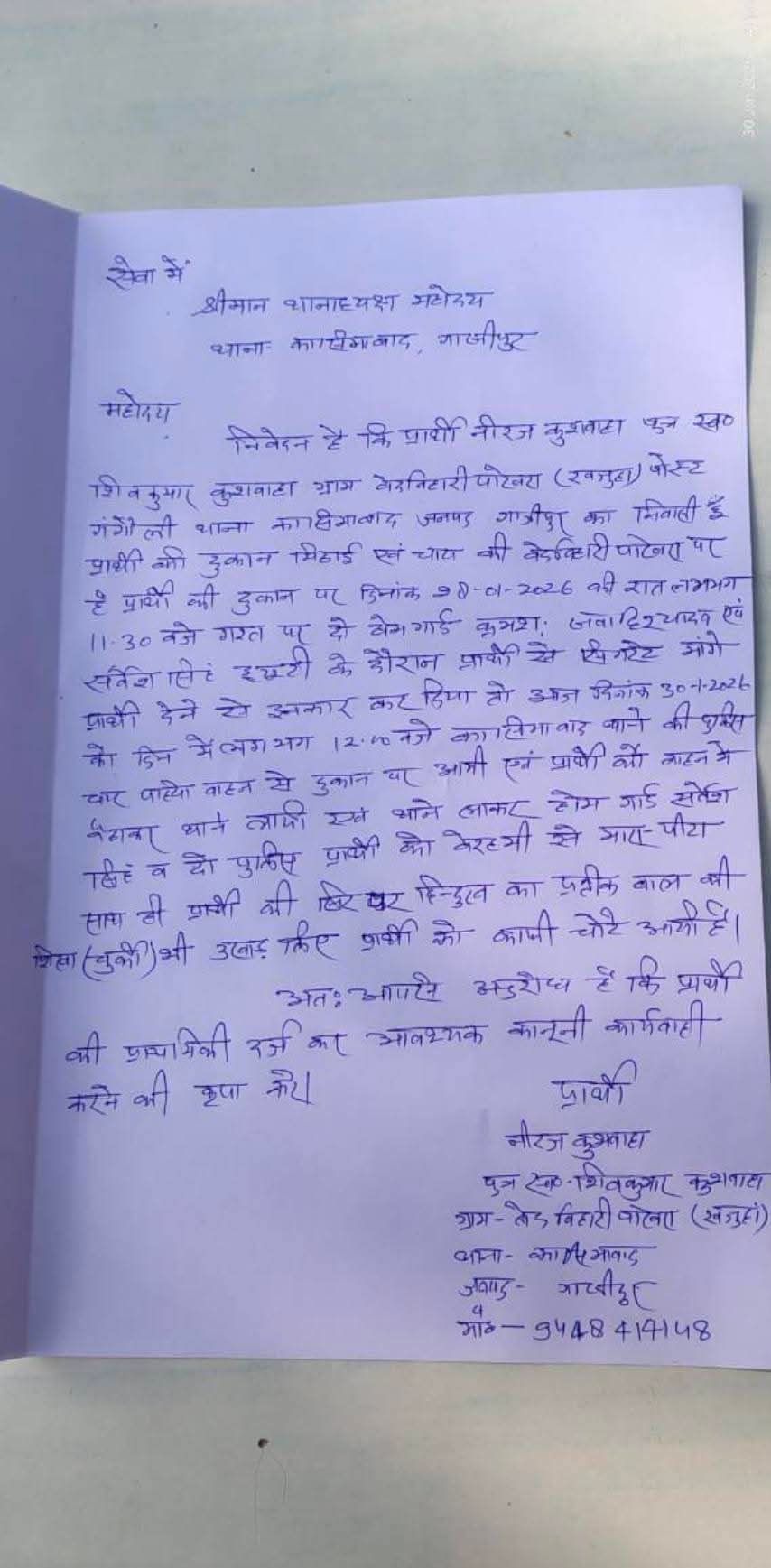 कासिमाबाद, गाजीपुर। जिले के कासिमाबाद थाना क्षेत्र से पुलिसिया उत्पीड़न का एक गंभीर मामला सामने आया है। एक स्थानीय दुकानदार ने होमगार्ड्स और पुलिस कर्मियों पर बेरहमी से मारपीट करने और धार्मिक भावनाओं को ठेस पहुँचाने का आरोप लगाया है।