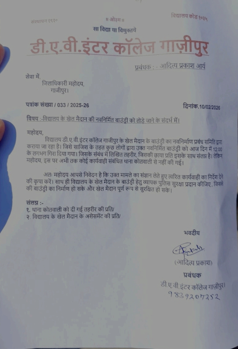 डी.ए.वी. इंटर कॉलेज, गाजीपुर के प्रबंधक आदित्य प्रकाश आर्य ने जिलाधिकारी को एक औपचारिक पत्र सौंपते हुए मामले की गंभीरता से अवगत कराया है। शिकायत के अनुसार, विद्यालय की प्रबंध समिति द्वारा खेल मैदान की घेराबंदी के लिए बाउंड्री का निर्माण कराया जा रहा था। आरोप है कि 10 फरवरी 2026 को दोपहर करीब 12:00 बजे, कुछ लोगों ने एक सोची-समझी साजिश के तहत इस नवनिर्मित दीवार को गिरा दिया।