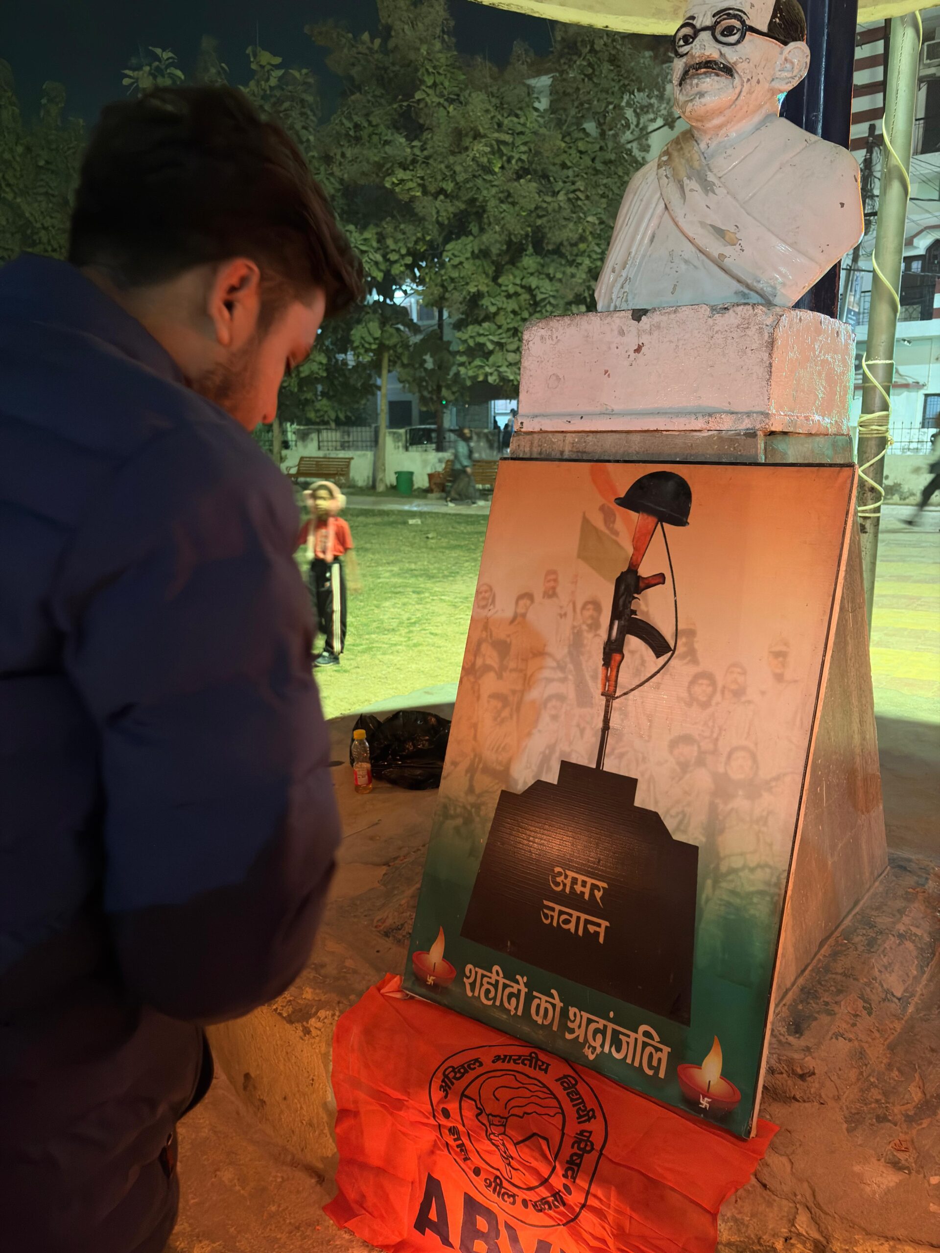 इस अवसर पर मुख्य रूप से उपस्थित अभाविप के प्रदेश कार्यकारिणी सदस्य ईशान पॉल ने शहीदों के प्रति अपनी संवेदना व्यक्त करते हुए कहा, “हमारे देश के जवानों के बलिदान को कभी भी भुलाया नहीं जा सकता। आज अगर हम अपने घरों में सुरक्षित हैं और सभी त्योहार व खुशियाँ बिना किसी भय के मना पा रहे हैं, तो यह केवल हमारे देश के वीर सपूतों की बदौलत ही संभव है।” उन्होंने आगे कहा कि यह राष्ट्र सेना के जवानों का आजीवन ऋणी रहेगा और उनकी शहादत युवा पीढ़ी के लिए राष्ट्रप्रेम की सर्वोच्च प्रेरणा है श्रद्धांजलि सभा के दौरान देशभक्ति का माहौल बना रहा और उपस्थित लोगों ने ‘भारत माता की जय’ और ‘शहीद जवान अमर रहें’ के नारे लगाए। इस कार्यक्रम में मुख्य रूप से राहुल यादव,आदर्श शर्मा, पुनीत,आदित्य सहित भारी संख्या में अभाविप कार्यकर्ता और क्षेत्रीय नागरिक उपस्थित रहे सभी ने नम आंखों से शहीदों को पुष्पांजलि अर्पित की।