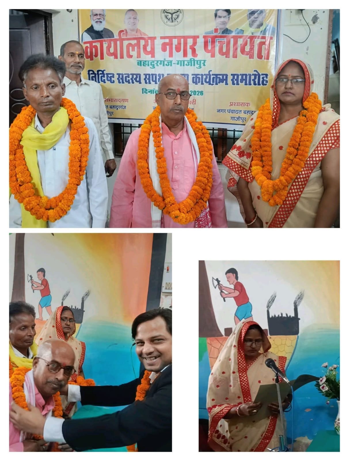 बहादुरगंज गाज़ीपुर۔ नगर पंचायत बहादुरगंज गाज़ीपुर में भारतीय जनता पार्टी द्वारा मनोनीत सदस्यों को एसडीएम कासिमाबाद लोकेश कुमार द्वारा माल्यार्पण कर गर्मजोशी के साथ पद एवं गोपनीयता की शपथ दिलाई गई। प्राप्त जानकारी के अनुसार नगर पंचायत बहादुरगंज गाज़ीपुर में उत्तर प्रदेश सरकार द्वारा नामित सभासदों रामायण गुप्ता, सोनी प्रजापति एवं राजेश कुमार को उत्तर प्रदेश सरकार द्वारा नामित सभासदों के रूप में चयनित किया गया था जिन्हें आज विधिववत नगर पंचायत बहादुरगंज गाज़ीपुर में पद एवं गोपनीयता की शपथ दिलाई गई। शपथ ग्रहण समारोह में उपजिलाधिकारी कासिमाबाद एवं नगर पंचायत बहादुरगंज गाज़ीपुर के प्रशासक लोकेश कुमार द्वारा माल्यार्पण कर गर्मजोशी के साथ स्वागत किया गया। रामायण गुप्ता ने कहा कि शासन की मंशा के अनुसार ही समाज के अंतिम छोर पर खड़े व्यक्ति तक सरकार की योजनाओं को पहुंचाने का कार्य प्राथमिकता के आधार पर किया जाएगा और नगर के विकास के लिए सभी के साथ कंधे से कंधा मिलाकर चलने का प्रयास किया जायेगा वहीं पर सोनी प्रजापति ने सभासद की शपथ लेने के उपरांत कहा कि हम प्रदेश सरकार एवं जिला अध्यक्ष भाजपा गाज़ीपुर एवं प्रदेश अध्यक्ष तथा माननीय मुख्यमंत्री जी के बेहद आभारी हैं कि उन्होंने मेरे ऊपर जिम्मेदारी डालते हुए लोगों की सेवा का अवसर प्रदान किया है हम सभी के लिए सकारात्मक रूप पहल करते हुए विकास कार्य को गति देने का कार्य करेंगे वहीं राजेश कुमार ने कहा कि हम अपनी पार्टी एवं क्षेत्रीय विधायक ओम प्रकाश राजभर के बेहद आभारी हैं जिनकी बदौलत मुझे समाज में सेवा करने का अवसर प्राप्त है इसके लिए हम सबका धन्यवाद ज्ञापित करते हैं जबकि कार्यक्रम के संचालक एवं भाजपा के वरिष्ठ नेता हरिशंकर राय ने कहा कि उत्तर प्रदेश सरकार द्वारा नामित सभासदों से आशा करते हैं कि यह नगर के विकास को गति देने का कार्य करेंगे। मुख्य अतिथि एवं प्रशासक लोकेश कुमार ने कहा कि बहादुरगंज से मेरा बहुत गहरा संबंध है मुझे आप लोगों सिलकर और बात करके खुशी मिलती है हमने आपसे जो भी वादा किया है उसको पूरा करने का कार्य भी किया है उम्मीद करते हैं कि आप सभी लोग विकास के नाम पर मिल जुलकर प्रयास करते हुए कस्बे को आगे ले जाने का कार्य करेंगे। वहीं पर अधिशासी अधिकारी धीरेन्द्र कुमार राय ने कहा कि मैं आप सबके ज्जवल भविष्य की कामना करते हुए आप सबको शुभकामनाएं देता हुए हूं नगर का विकास ही एकमात्र मेरा लक्ष्य है और आप सबके आगमन के आगमन के लिए धन्यवाद ज्ञापित करते हैं।इस अवसर पर उपजिलाधिकारी कासिमाबाद लोकेश अधिशाषी अधिकारी बहादुरगंज धीरेंद्र कुमार राय तथा नगर पंचायत बहादुरगंज गाज़ीपुर के सभासद गण एवं कर्मचारी तथा नगर के गणमान्य ल