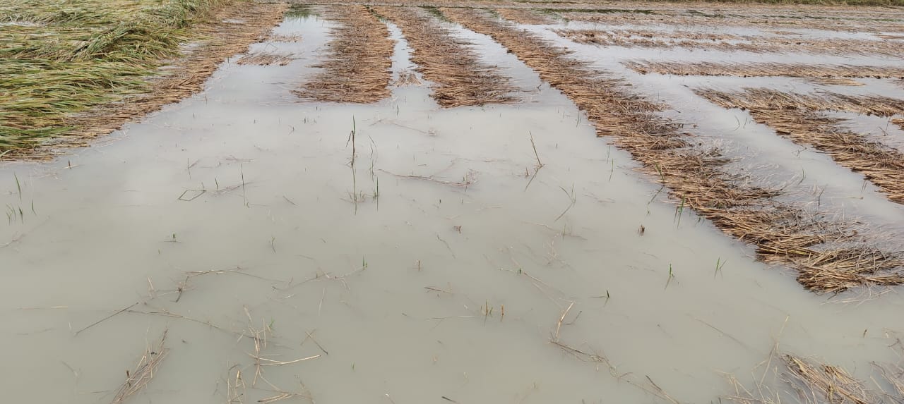 “बारिश और तेज़ हवाओं से खेतों में पड़ी धान की फसल जलमग्न, किसानों की मेहनत पर पानी फिरा”