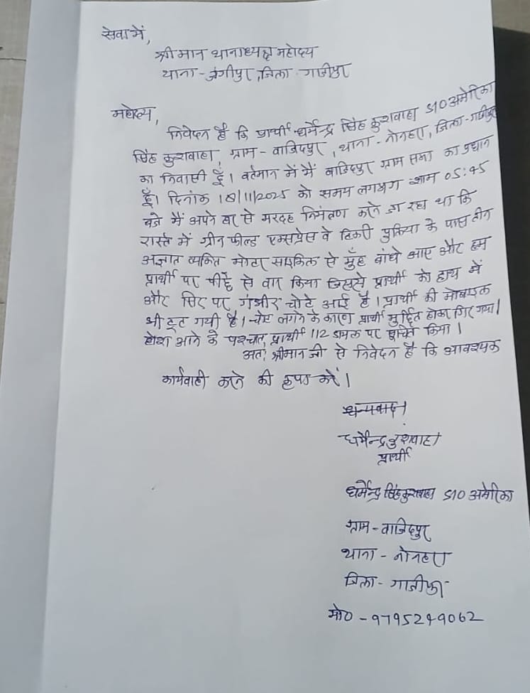 जंगीपुर: स्थानीय थाना अंतर्गत वाजिदपुर के ग्रामप्रधान धर्मेंद्र कुशवाहा पर अज्ञात हमलावरों ने देर शाम जानलेवा हमला किया, जिसमें उन्हें गंभीर चोटें आई हैं। हमले में उनका मोबाइल भी टूट गया है। उन्हें गाजीपुर सदर अस्पताल से बनारस बीएचयू के लिए रिफर किया गया है।हमले की सूचना मिलने पर डायल 112 पुलिस ने मौके पर पहुंच कर जानकारी ली। और जांच शुरू कर दी है। धर्मेंद्र कुशवाहा ने बताया कि हमला करने वाले तीन अज्ञात व्यक्ति मोटरसाइकिल पर आए थे और उन्होंने पीछे से हमला किया।