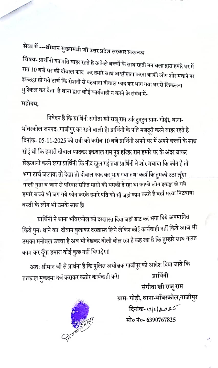 गाजीपुर (भांवरकोल): जनपद के भांवरकोल क्षेत्र के ग्राम गोड़ी में मानवता को शर्मसार करने वाली घटना सामने आई है। एक गरीब महिला के घर को दबंगों ने आग के हवाले कर दिया सिर से छत छिन जाने के बाद अब पीड़िता अपने छोटे-छोटे बच्चों के साथ खुले आसमान के नीचे रहने को मजबूर है। आरोप है कि खुद को ‘नेता’ बताने वाले आरोपी ने पहले छेड़खानी की और अब पूरे परिवार को जान से मारने की धमकी दे रहा है।