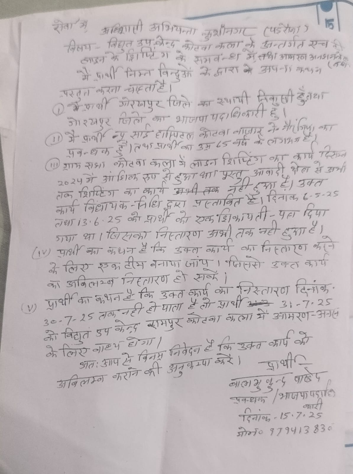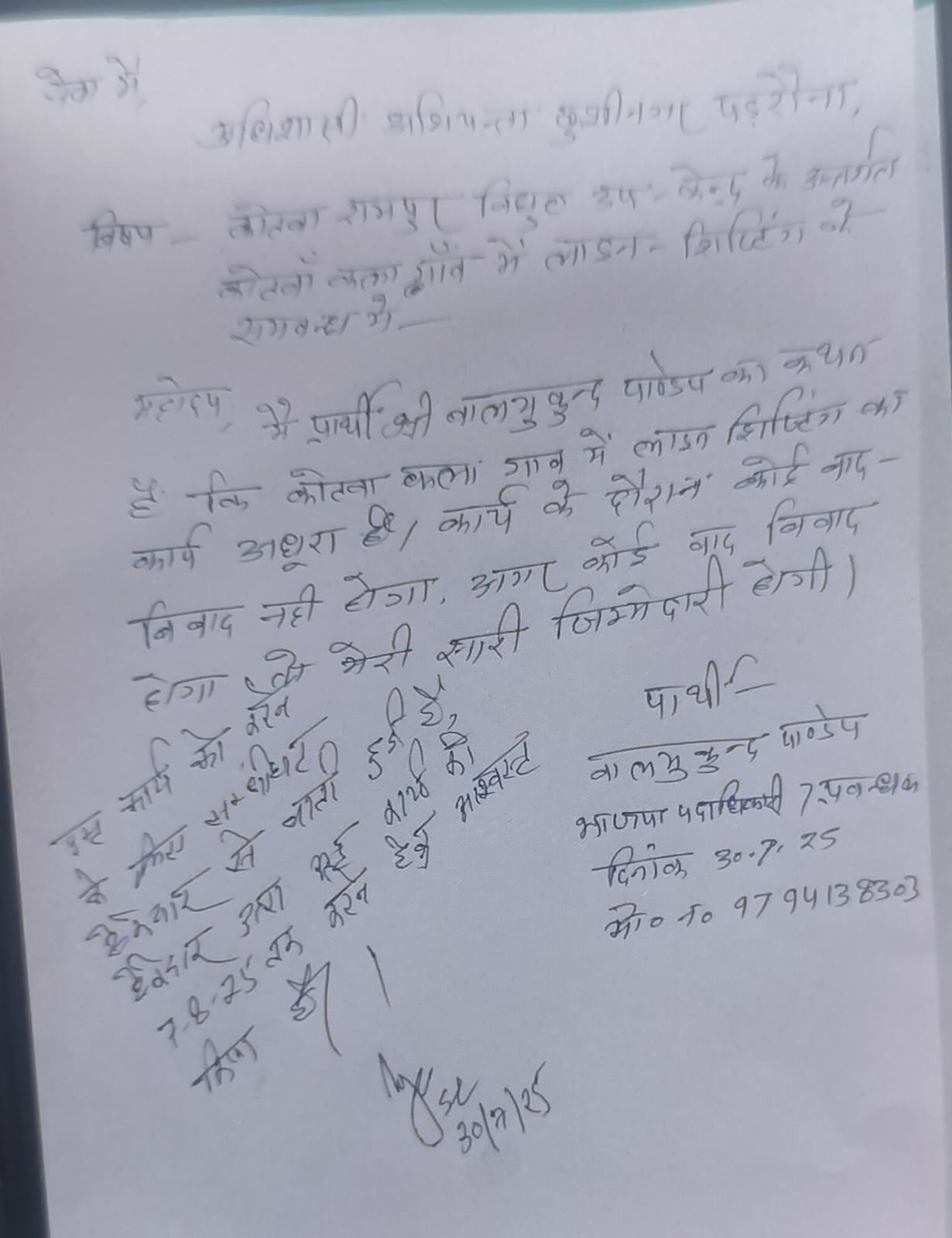 कुशीनगर । कोटवा कला में लंबे समय से अधूरी पड़ी लाइन शिफ्टिंग का कार्य अब आमजन के लिए परेशानी का कारण बनता जा रहा है। भाजपा के वरिष्ठ नेता बालमुकुंद पाण्डेय ने इस मुद्दे को गंभीरता से लेते हुए अधिशासी अभियंता कुशीनगर को प्रार्थना पत्र सौंपकर कार्य शीघ्र पूर्ण कराने की मांग को लेकर अनशन करने की चेतावनी दी थी।