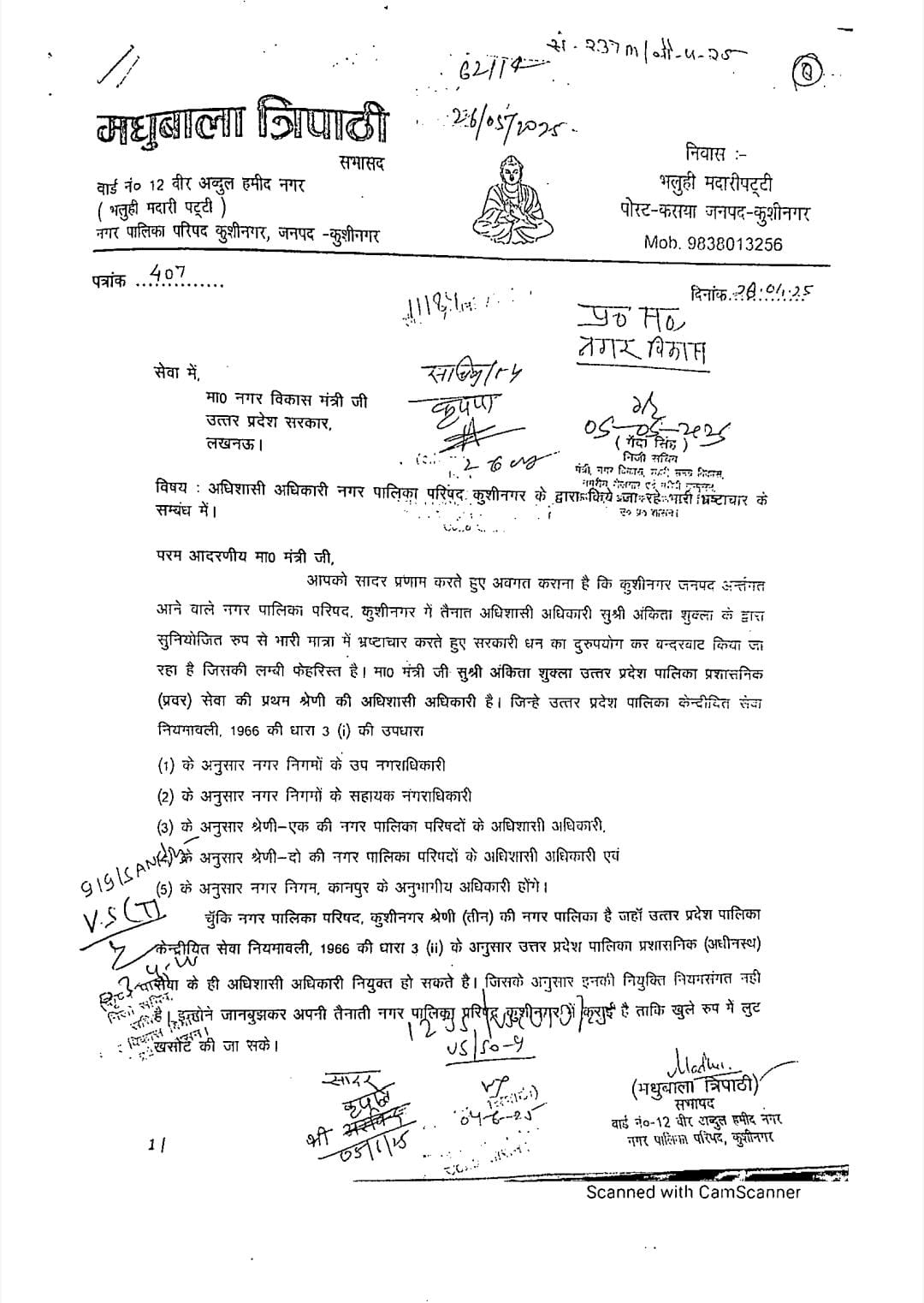 सूबे के नगर विकास मंत्रालय के अनुभाग 4 के उप सचिव मोहम्मद वासिफ ने 9 जुलाई – 2025 को जिलाधिकारी को भेजे गये पत्र संख्या – 237एम/नौ-4-2025 मे सभासद मघुबाला त्रिपाठी के शिकायत को गंभीरता से लेते हुए कुशीनगर नगर पालिका परिषद की अधिशासी अधिकारी अंकिता शुक्ला के विरुद्ध बिन्दुवार जांच कराकर यथाशीघ्र शासन को रिपोर्ट भेजने के लिए निर्देशित किया है। यह बात दीगर है कि अब तक ईओ अंकिता शुक्ला इस गफलत में है कि नपा अध्यक्ष प्रतिनिधि राकेश जायसवाल सहित अन्य राजनीति पकड के कारण कोई उनका बाल-बाका नही बिगाड सकता है। हालाकि सूत्रो का दावा है कि सभासद मघुबाला के आरोपों को निष्पक्षता से जांच कर दी गयी तो अधिकारी अधिकारी पर कार्रवाई तय है।