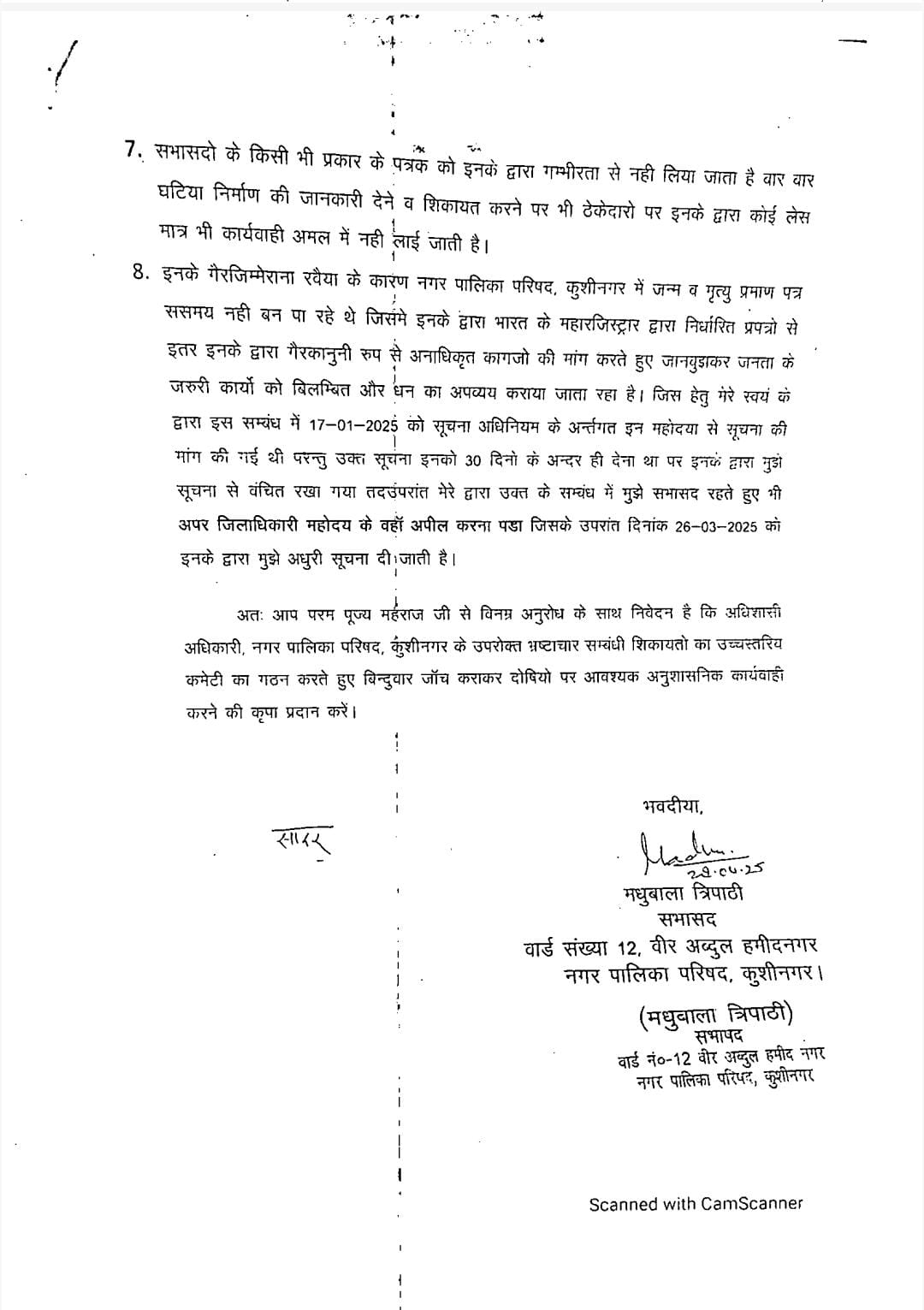 सभासद मघुबाला त्रिपाठी का आरोप है कि ईओ अंकिता शुक्ला की गैरजिम्मेराना रवैया के कारण नगर पालिका परिषद, कुशीनगर में जन्म व मृत्यु प्रमाण पत्र ससमय नही बन रहे थे।महारजिस्ट्रार द्वारा निर्धारित प्रपत्रो को दरकिनार कर ईओ अनाधिकृत कागजो की मांग करते हुए आम जनमानस को परेशान करती है ताकि धन उगाही हो सके। सभासद ने बताया कि उन्होने स्वयं इस सम्बंध में 17 जनवरी 2025 को सूचना अधिकार अधिनियम के तहत ईओ से सूचना की मांग की गई थी परन्तु ईओ ने तीस दिन बाद उन्हे सूचना उपलब्ध नही कराया। इसके बाद वह अपर जिलाधिकारी के वहा अपील की, एडीएम के निर्देश के बाद 26 मार्च 2025 को आधा-अधूरा सूचना उपलब्ध करायी गयी।