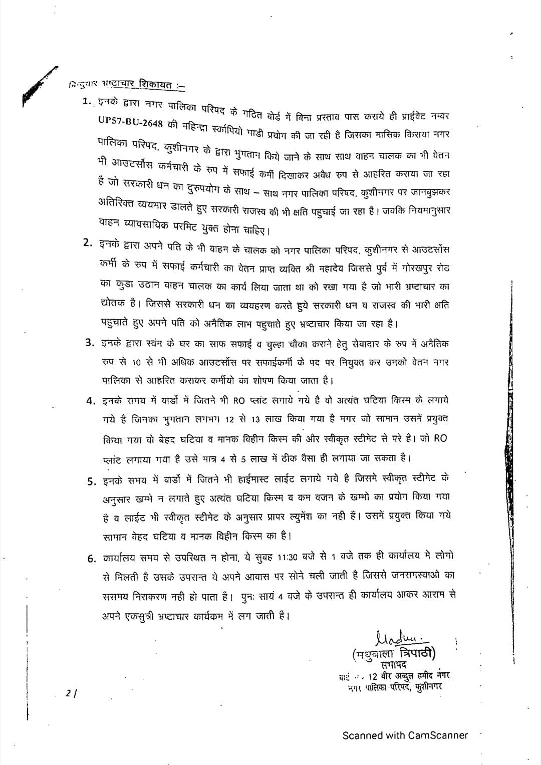 नगर पालिका परिषद कुशीनगर के बीर अब्दुल हमीद नगर मुहल्ले की सभासद मघुबाला त्रिपाठी द्वारा नगर विकास मंत्री को भेजे गये शिकायत पत्र में कहा गया है कि अधिशासी अधिकारी अंकिता शुक्ला,नगर पालिका परिषद के गठित बोर्ड की बैठक में बिना प्रस्ताव पारित कराये यूपी57बीयू 2648 नम्बर की प्राइवेट महिन्द्रा स्कोपियो गाडी प्रयोग कर नगर पालिका परिषद से उस वाहन का पूरा खर्च व्यय कर रही है। इसके अलावा वाहन चालक का वेतन आउटसोर्सिंग सफाई कर्मचारी दिखाकर किया जा रहा है, जो न सिर्फ सरकारी धन का दुरुपयोग है बल्कि नगर पालिका परिषद पर ईओ द्वारा जानबुझकर अतिरिक्त व्ययभार डालते हुए सरकारी राजस्य की क्षति पहुंचाई जा रही है जबकि नियमानुसार वाहन व्यावसायिक परमिट युक्त होना चाहिए। इसी तरह अधिशासी अधिकारी ने अपने आवास पर साफ सफाई व चुल्हा चौका करने के लिए अनैतिक रुप से दस से अधिक आउटसोर्सिंग सफाई कर्मचारियों को नियुक्त कर अपने घर का कामकाज कराया जाता है और उन कर्मचारियों को नगर पालिका से वेतन आहरित किया जा रहा है। ईओ अंकिता शुक्ला के कार्यकाल मे अब तक