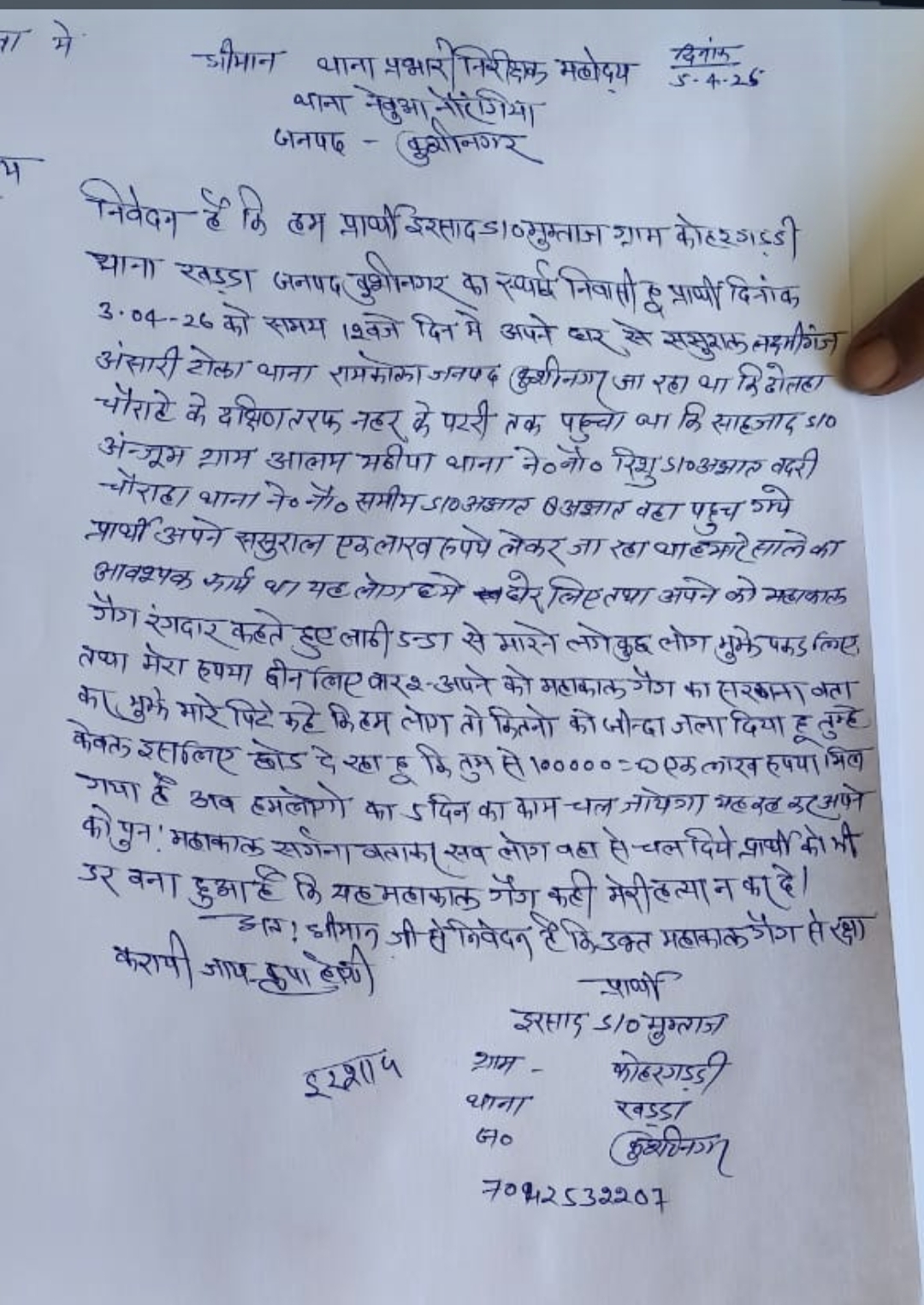 कुशीनगर ।नेबुआ नौरंगिया थाना क्षेत्र में रंगदारी और लूट की एक सनसनीखेज घटना सामने आई है। खड्डा थाना क्षेत्र के कोहरगद्दी निवासी इरसाद अपने ससुराल लक्ष्मीगंज से एक लाख रुपये लेकर अपने साले को देने जा रहा था। इसी दौरान नेबुआ नौरंगिया थाना क्षेत्र के ढोलहा गांव के समीप मुख्य पश्चिमी गंडक नहर की पटरी पर कुछ मनबढ़ युवकों ने उसे घेर लिया।