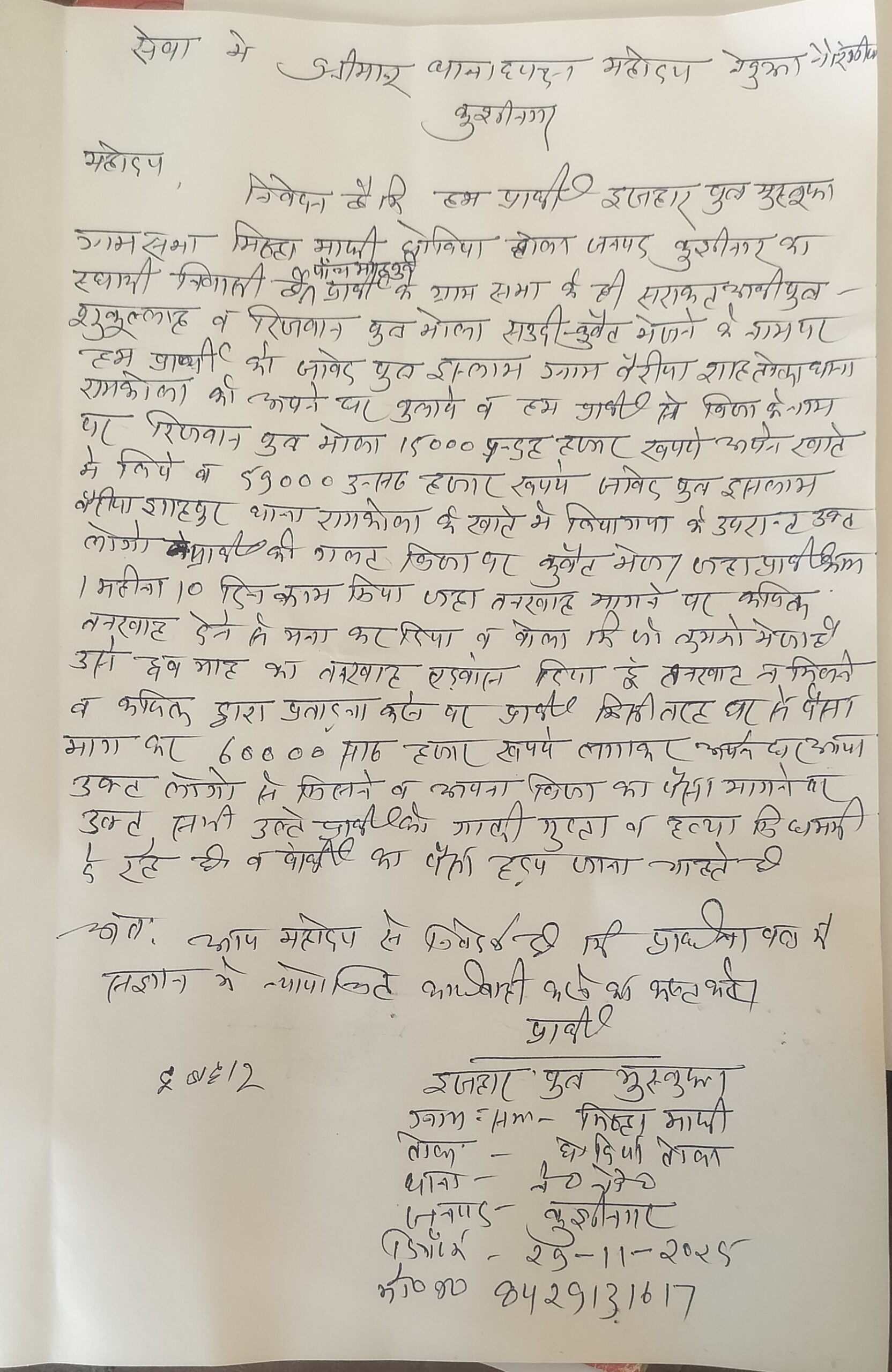 प्रार्थना पत्र में इजहार ने बताया कि गांव के ही दोनों आरोपितों ने उसे बैरिया निवासी जावेद से अपने घर मिलवाया। आरोप है कि इन लोगों ने मिलकर उससे 74 हजार रुपये लेकर कुवैत भेजने का वादा किया, लेकिन गलत वीज़ा पर भेज दिया। इजहार के अनुसार वह कुवैत में एक माह 10 दिन तक काम करता रहा, लेकिन जब उसने अपने मेहनताने की मांग की तो वहां मौजूद कपिल ने पैसे देने से इंकार कर दिया और कहा कि छह माह का एडवांस पैसा वीजा धारकों द्वारा ले लिया गया है, इसलिए वहीं मांग करो।