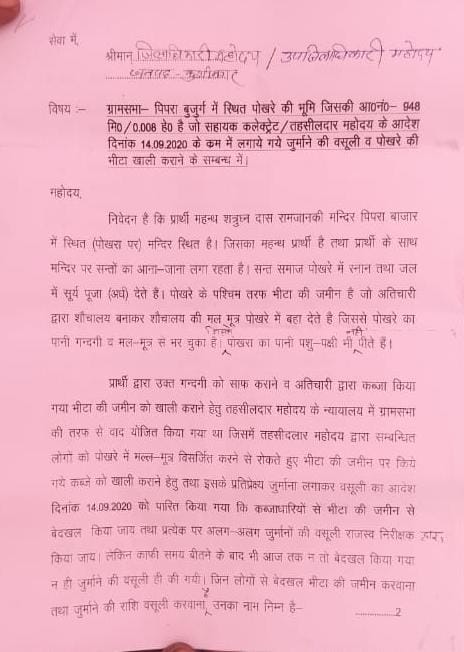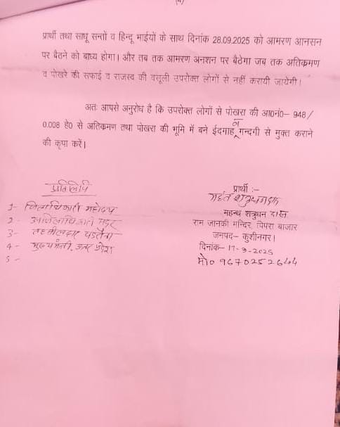 कुशीनगर । पिपरा बाजार का ऐतिहासिक विशाल पोखरा आज अतिक्रमण और जल प्रदूषण की समस्या से जूझ रहा है। जिम्मेदार अधिकारियों की अनदेखी से क्षुब्ध होकर रामजानकी मंदिर के महन्थ शत्रुघ्न दास उसके जीर्णोद्धार के लिए आमरण आसन पर बैठ गए है।जो समाचार लिखे जाने तक जारी रहा।