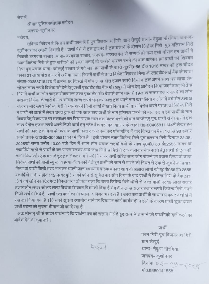 कुशीनगर । नेबुआ नौरंगिया थाना क्षेत्र के सेखुई गांव निवासी पवन गिरी पुत्र विजयनाथ गिरी ने ट्रक खरीद-फरोख्त के नाम पर लाखों रुपये की ठगी करने तथा ठगी करने वाले व्यक्ति द्वारा ही उसके घर से ट्रक लेकर भाग जाने का आरोप लगाते हुए पुलिस अधीक्षक कुशीनगर को प्रार्थना पत्र देकर न्याय की गुहार लगाई है।